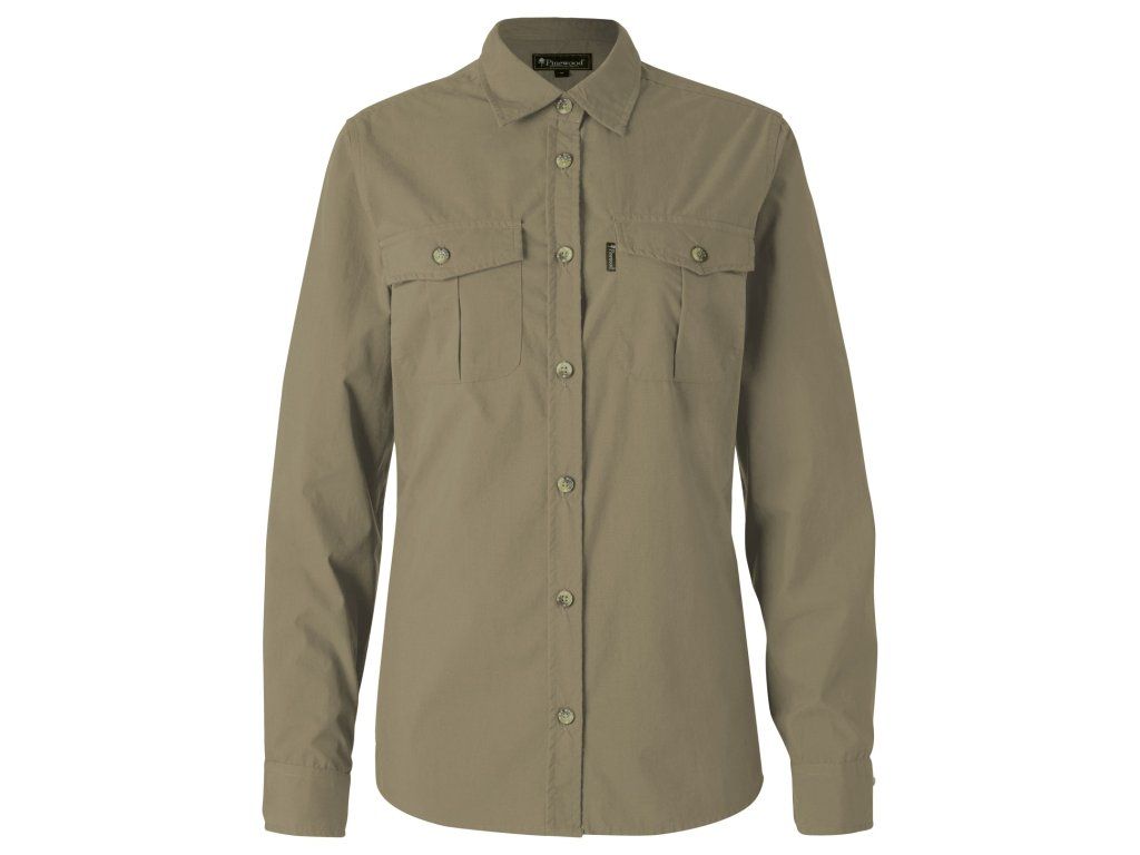Tato dámská košile s dlouhým rukávem je ušita z předepraného materiálu pro vyšší komfort a hladké padnutí. Celopropínací provedení se zapínáním na knoflíky doplňují dvě praktické náprsní kapsy s klopou a zapínáním na knoflík, které dodávají nadčasový outdoorový charakter. Materiál je ošetřen impregnací, která pomáhá chránit proti komárům a klíšťatům. Výsledkem je univerzální a elegantní outdoorová košile — ideální pro celoroční nošení, uvnitř i venku.