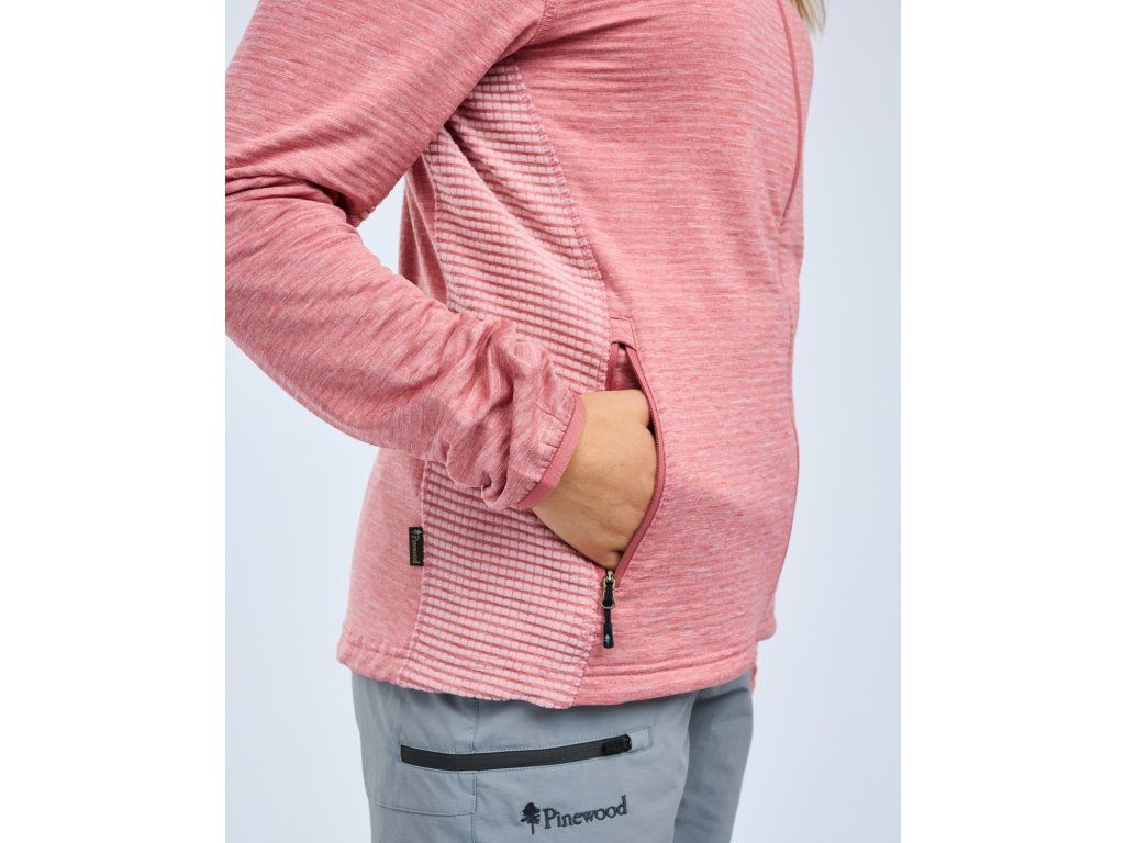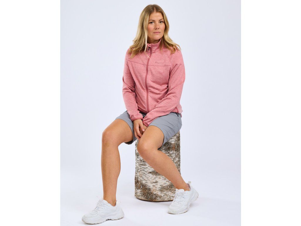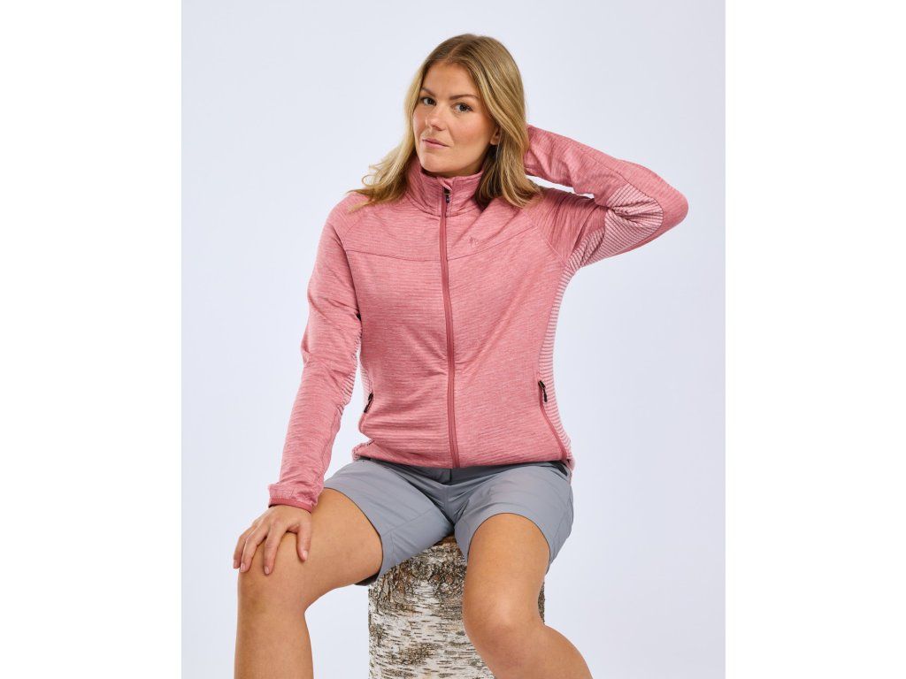 Dámská fleecová bunda Abisko je lehký a prodyšný fleece navržený pro aktivní pohyb. Je vyrobena z vaflově strukturovaného materiálu, který zachycuje tělesné teplo v malých vzduchových kapsách a poskytuje tak výborný tepelný komfort vzhledem ke své nízké hmotnosti a tenkosti. Fleece má gramáž 155 g/m2 a díky jemné vaflové struktuře také rychle schne. Bunda je vybavena předním zipem a dvěma kapsami na ruce se zipy. Mírně zvýšený límec pomáhá zahřát krk a stahování ve spodním lemu umožňuje upravit střih.