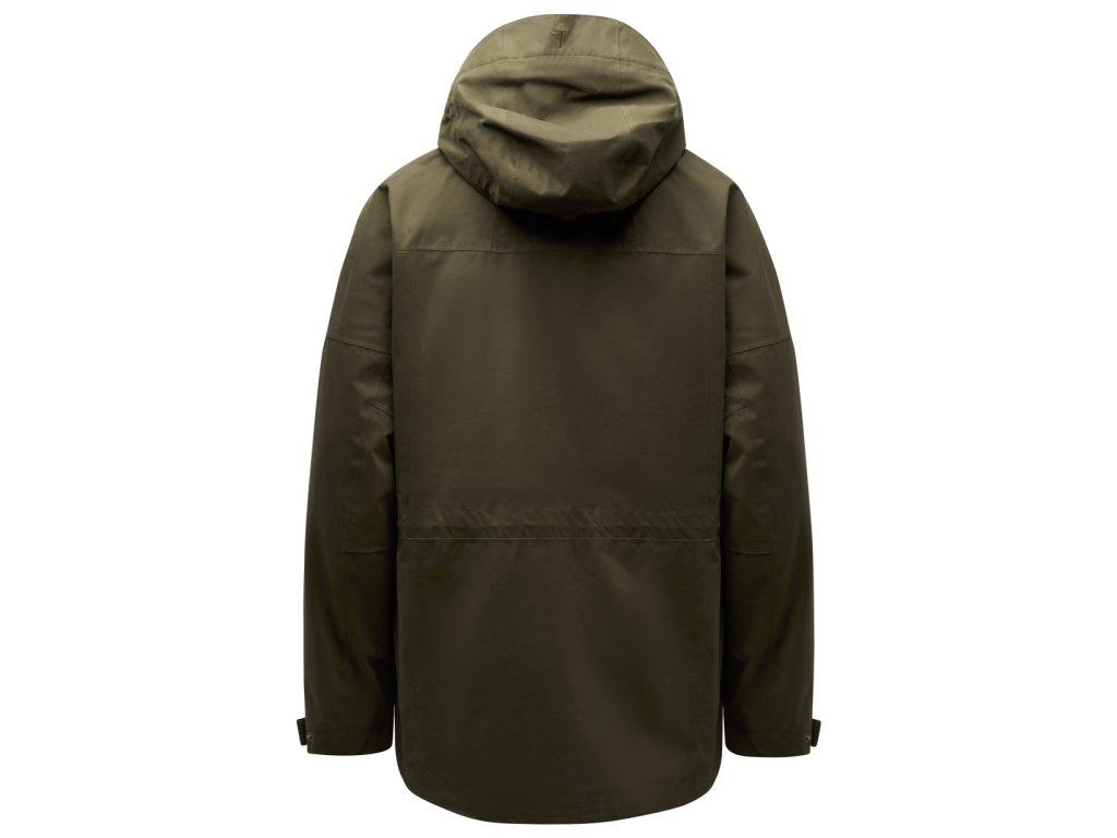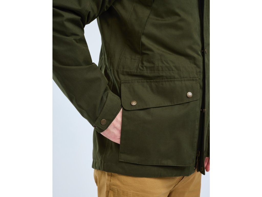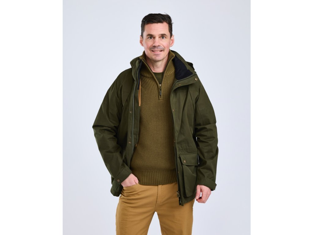 Pánská lovecká bunda nadčasového vzhledu, ideální pro lovecké akce na panství, po lovu a každodenní použití. Prodyšná a ochranná ve vlhkém počasí díky dvouvrstvému materiálu s větru a voděodolnou membránou, podlepenými švy a povrchem ošetřeným DWR úpravou. Má dvoucestný zip s légu, nastavitelnou šňůrku v pase a na lemu a měkký fleecem podšitý límec pro extra pohodlí.