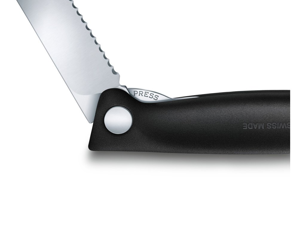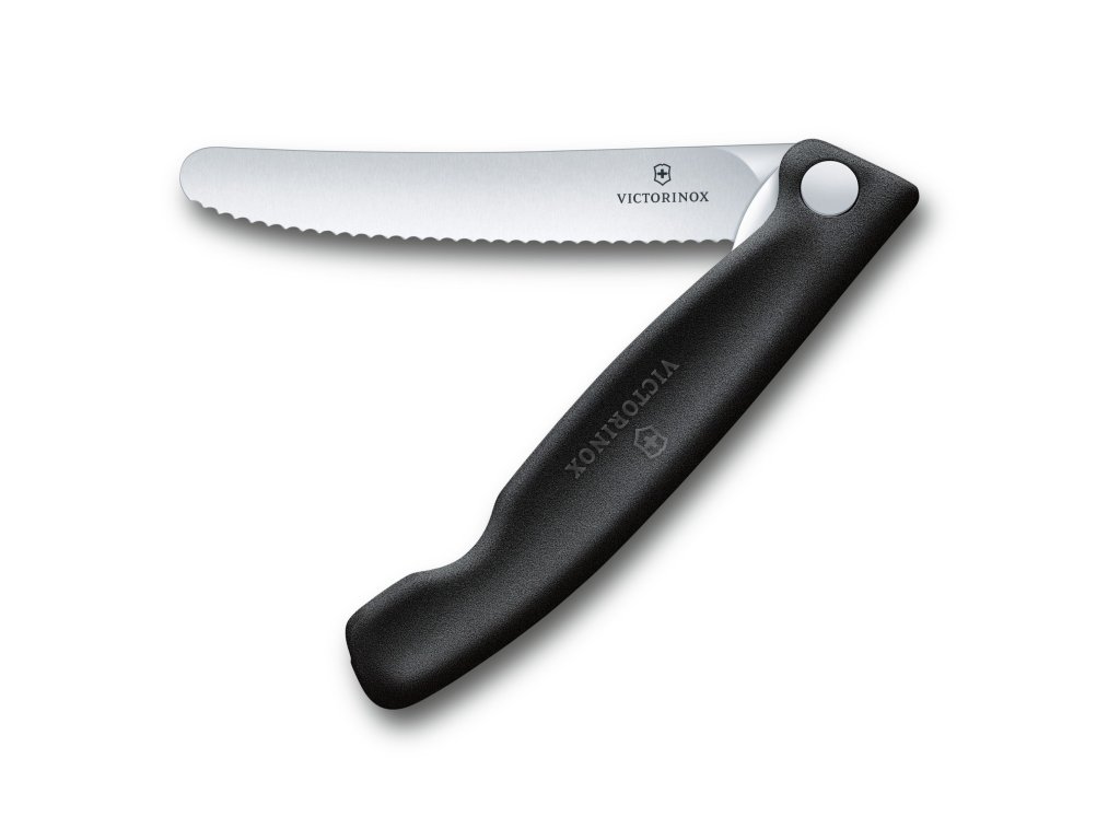 Skládací svačinový nůž s vlnkovanou čepelí dlouhou 11 cm vhodnou zejména pro krájení potravin s tužším povrchem a měkkým středem - rajčata, pečivo atd. Nůž je vybaven pojistkou.