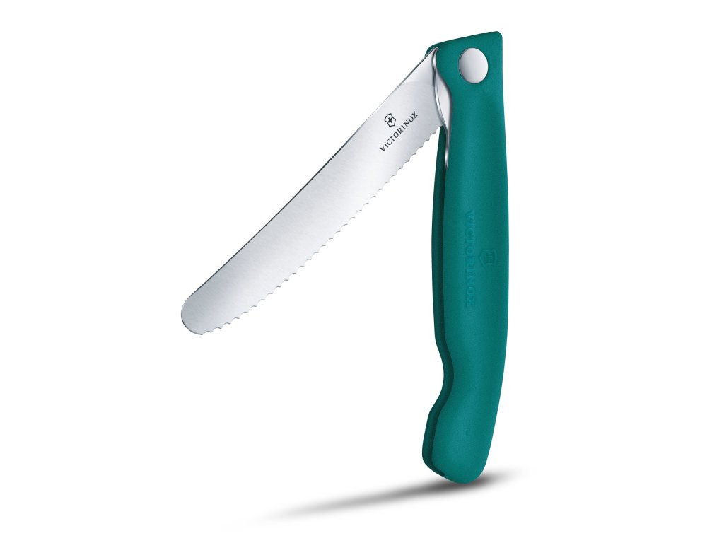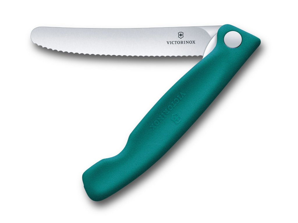 Skládací svačinový nůž s vlnkovanou čepelí dlouhou 11 cm vhodnou zejména pro krájení potravin s tužším povrchem a měkkým středem - rajčata, pečivo atd. Nůž je vybaven pojistkou.