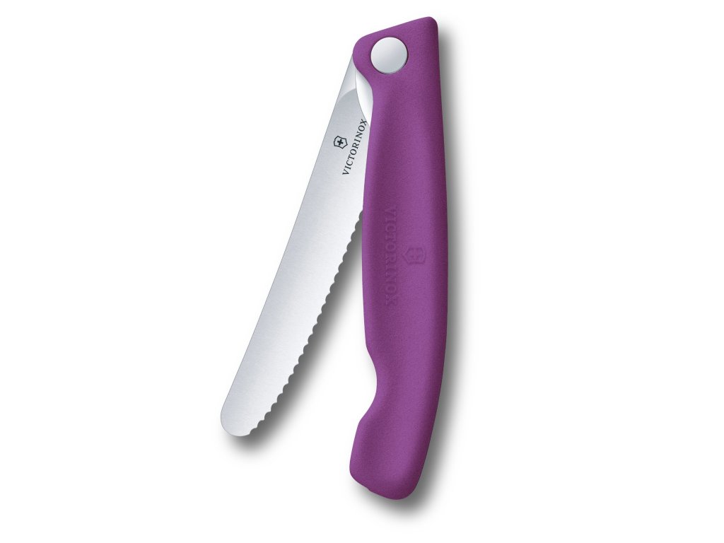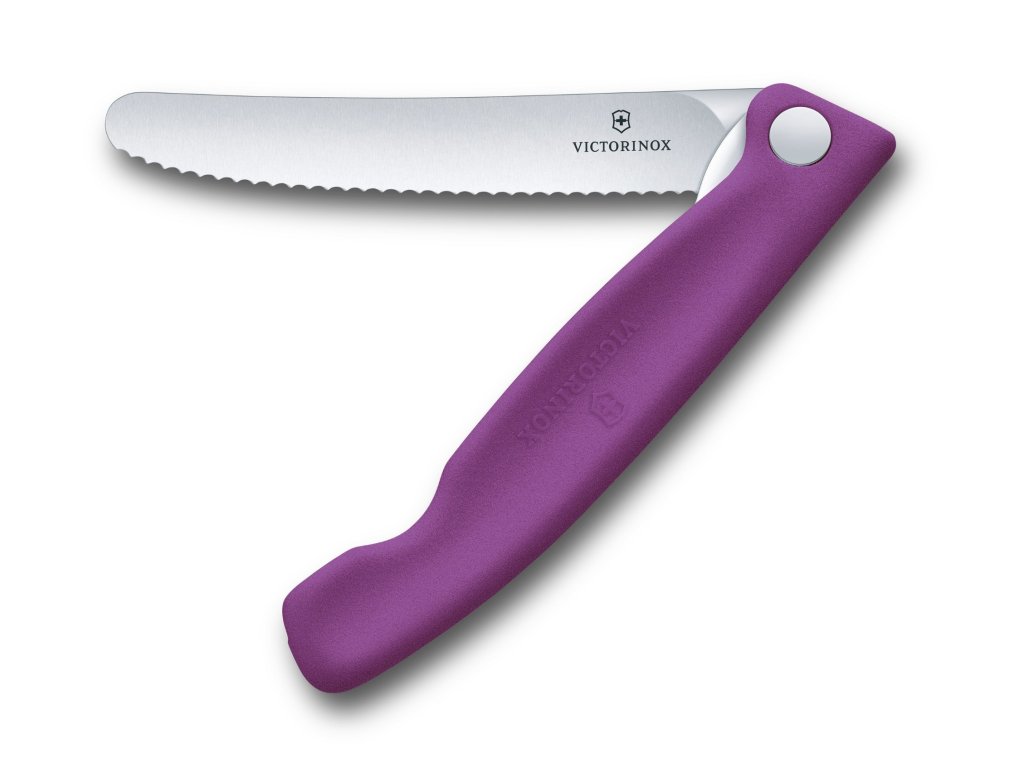 Skládací svačinový nůž s vlnkovanou čepelí dlouhou 11 cm vhodnou zejména pro krájení potravin s tužším povrchem a měkkým středem - rajčata, pečivo atd. Nůž je vybaven pojistkou.