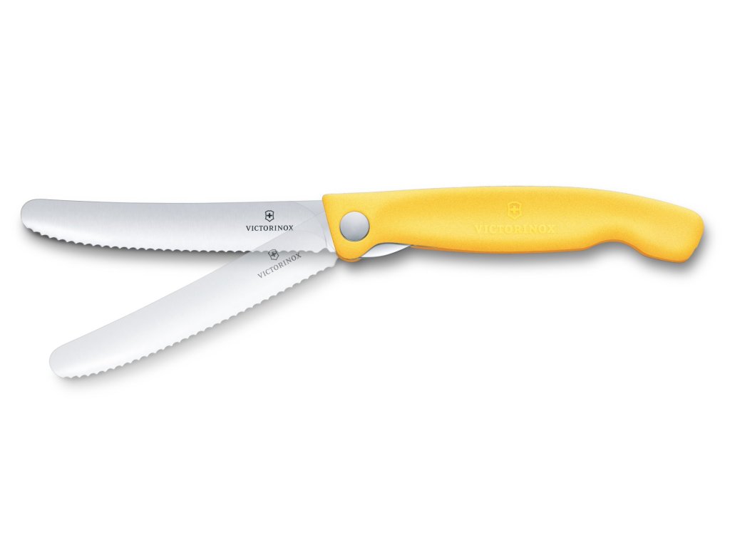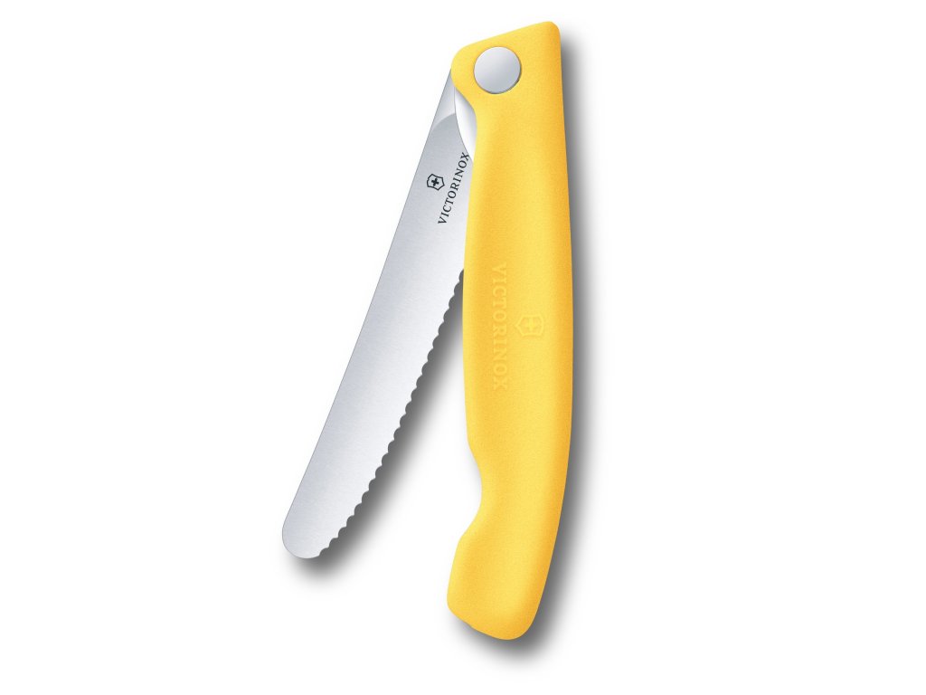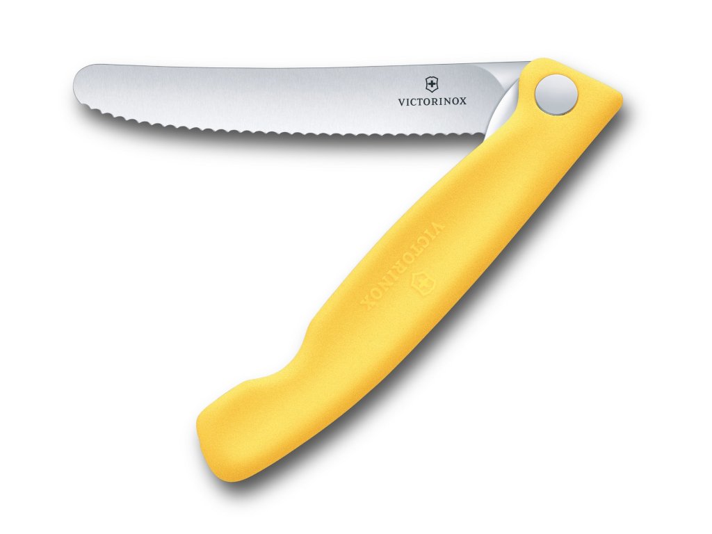 Skládací svačinový nůž s vlnkovanou čepelí dlouhou 11 cm vhodnou zejména pro krájení potravin s tužším povrchem a měkkým středem - rajčata, pečivo atd. Nůž je vybaven pojistkou.