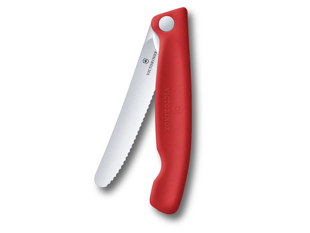 Skládací svačinový nůž s vlnkovanou čepelí dlouhou 11 cm vhodnou zejména pro krájení potravin s tužším povrchem a měkkým středem - rajčata, pečivo atd. Nůž je vybaven pojistkou.