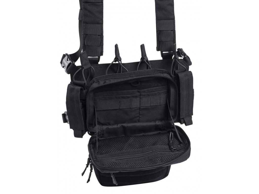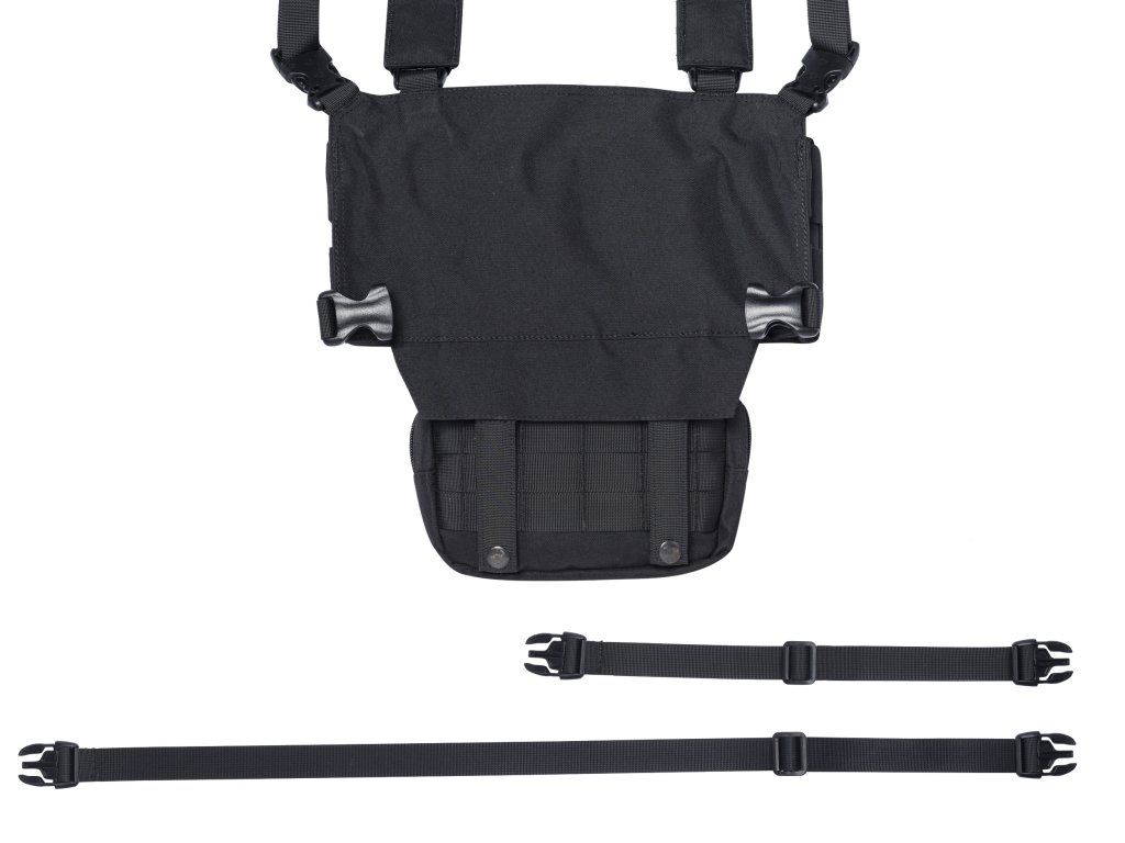 Rozhraní MOLLE umožňuje uživatelům přizpůsobit chest rig podle vlastních potřeb. Na přední straně se nachází velká víceúčelová kapsa a ve spodní části odnímatelná kapsa. Chest rig je vybaven dvěma nastavitelnými upevňovacími popruhy různých délek, které zajišťují optimální přizpůsobení.