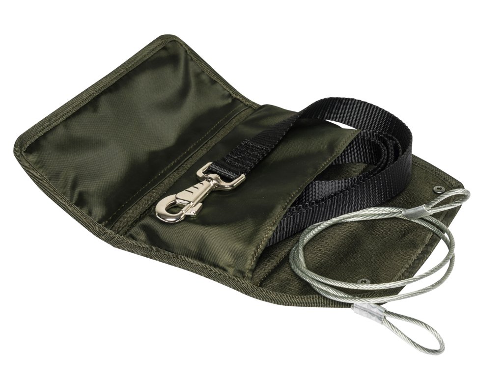 Otočná karabina a praktické pouzdro, které lze při tažení použít jako ramenní polstrování.